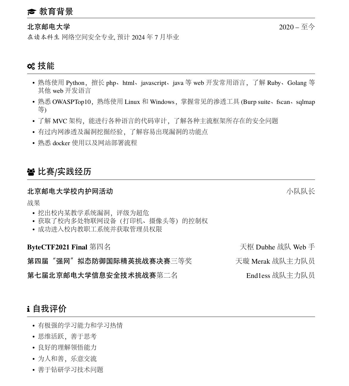 因为觉得光靠打CTF还是跟实际工作场景会有一些差别,所以这学期尝试找一些实习。找实习的第一步就是写简历,写简历基本上就是把各种东西往里塞,语言和工具啥的,用过就写擅长,听过就写了解